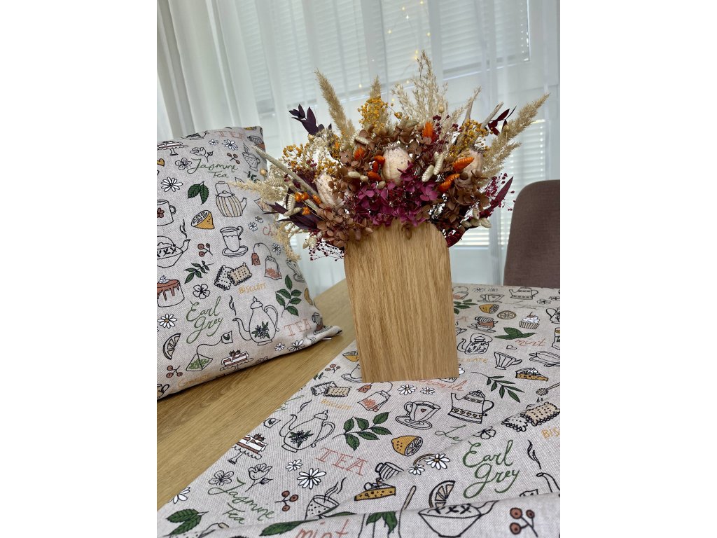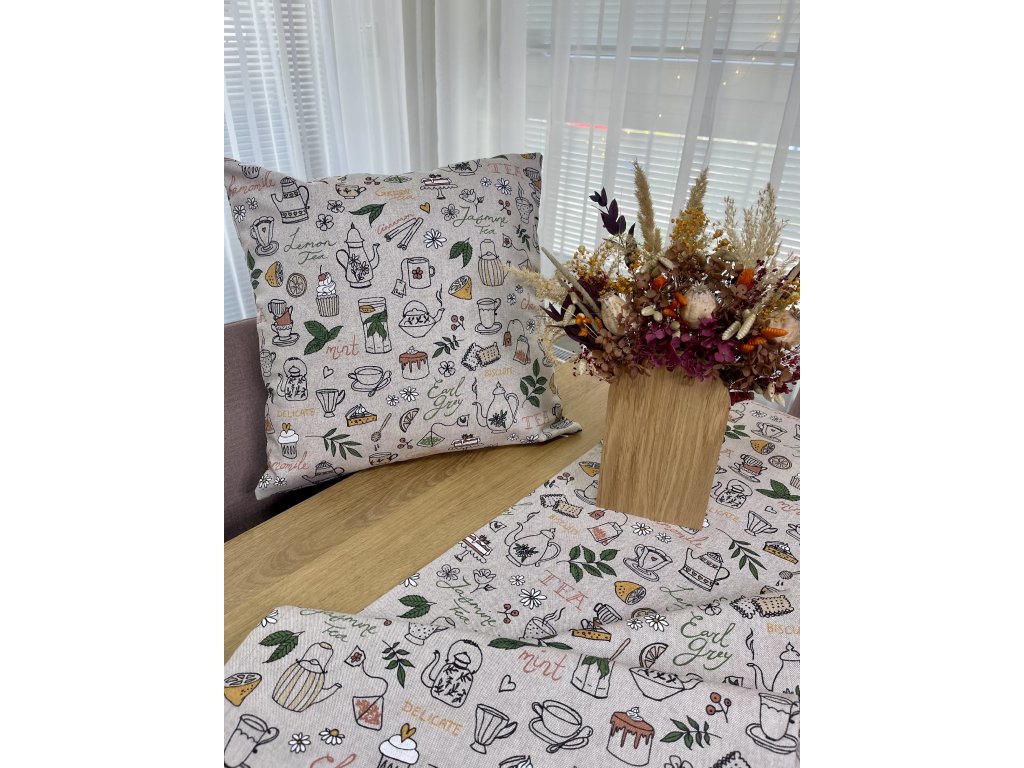Obliečky na vankúše sú ušité z dekoratívnej bavlny, ktorá zaujme potlačou čajových lístkov, ktorá Vám umožňuje vychutnať si domácu pohodu pri šálke obľúbeného čaju.