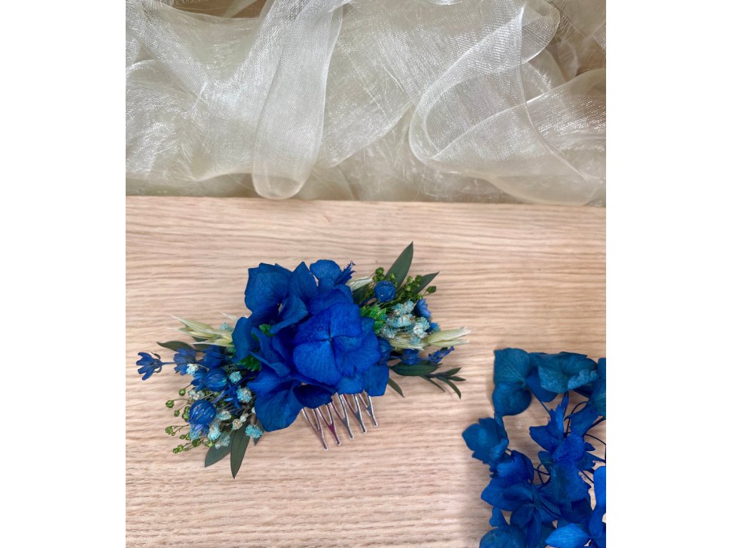 S ručne tvoreným kvetinovým hrebienkom rozkvitnete každá nevesta, družička, či malá víla na fotení alebo 1. svätom príjimaní. Hrebienok Vás upúta sýtymi tónmi parížskej modrej na stabilizovanej hortenzii, ktorá sa prelína s lístkami eukalyptu a jemnej gypsomilky.