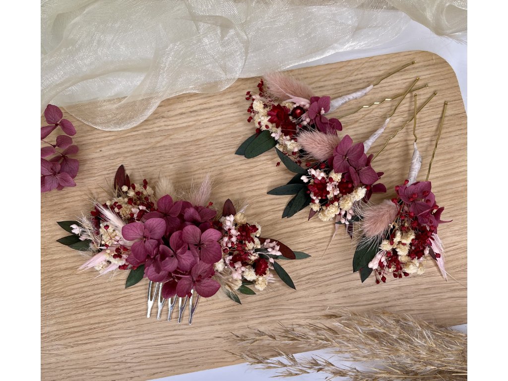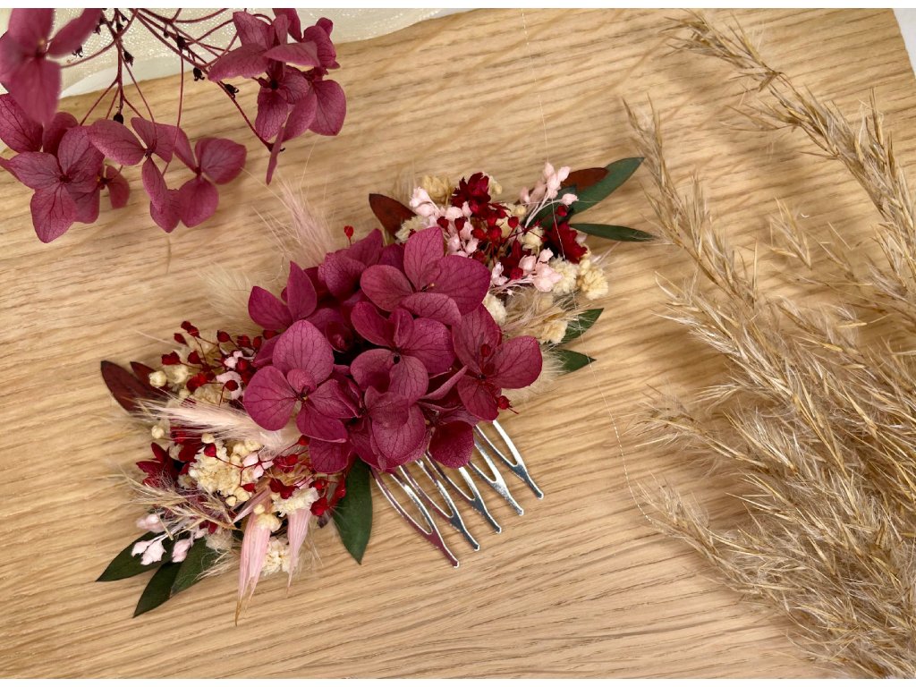 S ručne tvoreným kvetinovým hrebienkom rozkvitnete každá nevesta, družička, či malá víla na fotení alebo 1. svätom príjimaní. Hrebienok Vás upúta sýtymi tónmi parížskej modrej na stabilizovanej hortenzii, ktorá sa prelína s lístkami eukalyptu a jemnej gypsomilky.