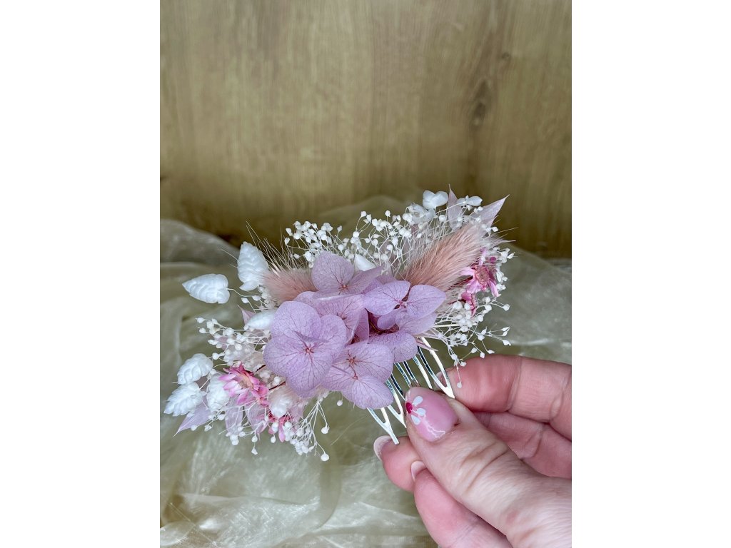 Kvetinový hrebienok v jemných pudrovo fialových tónoch s hortenziou je skvelým doplnkom k šatám, či už idete na svadbu, ples alebo rodinnú oslavu.