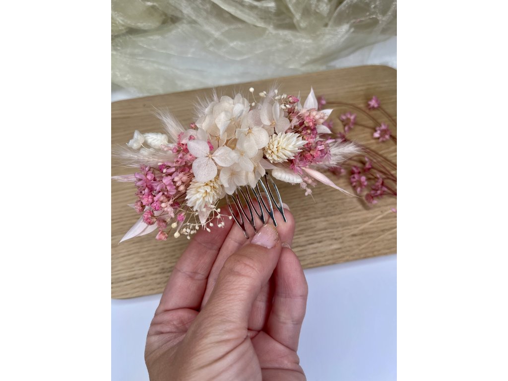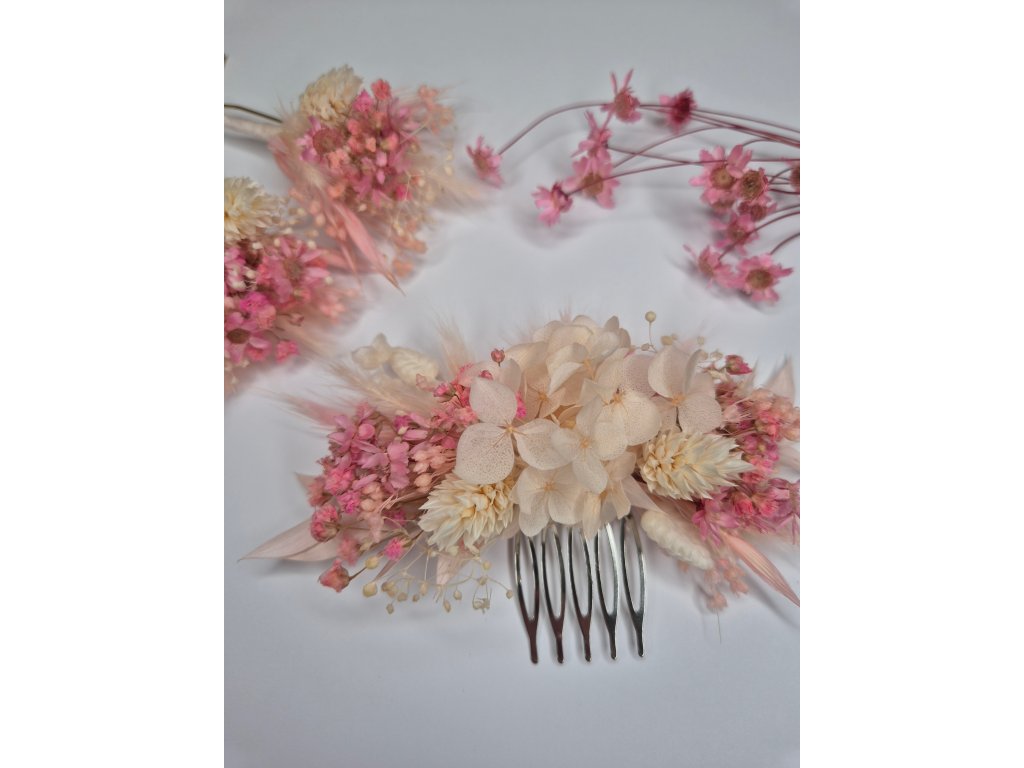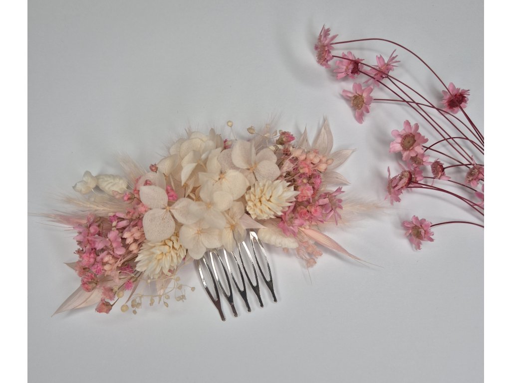 Kvetinový hrebienok v jemných pudrovo ružových tónoch s hortenziou je skvelým doplnkom k šatám, či už idete na svadbu, ples alebo rodinnú oslavu.