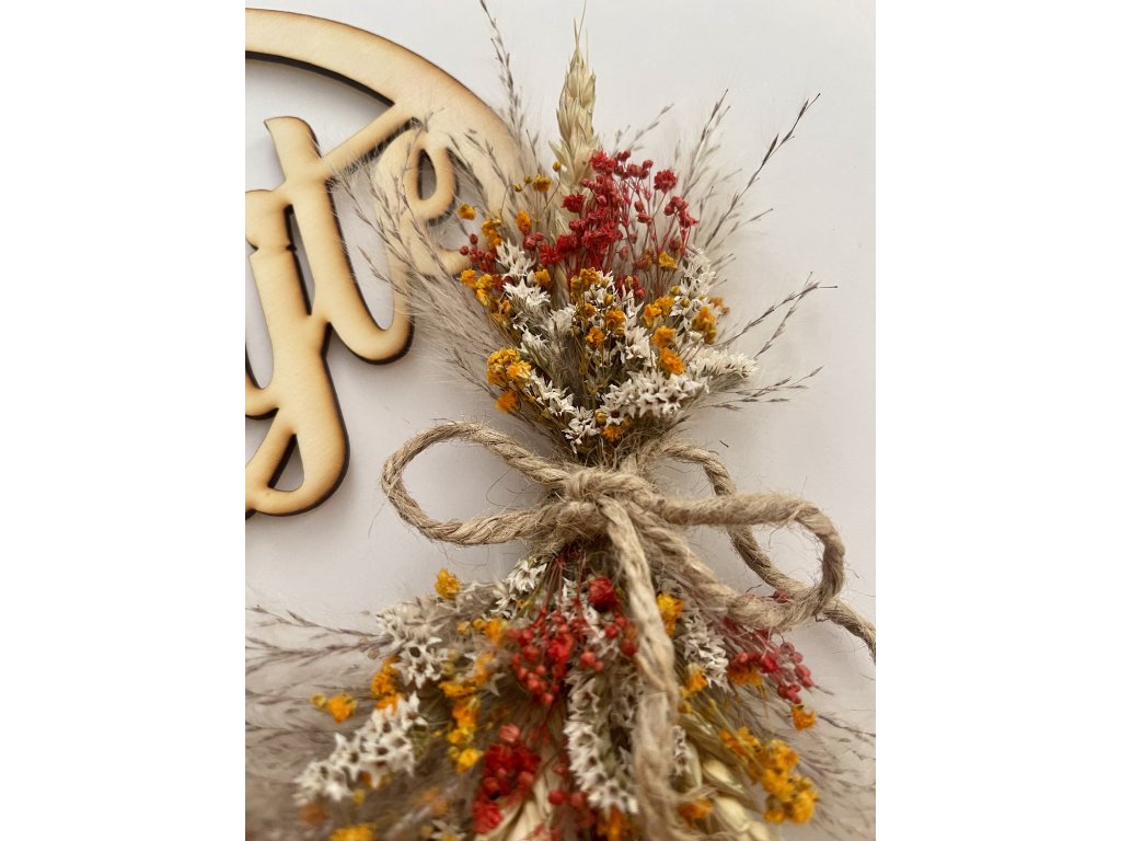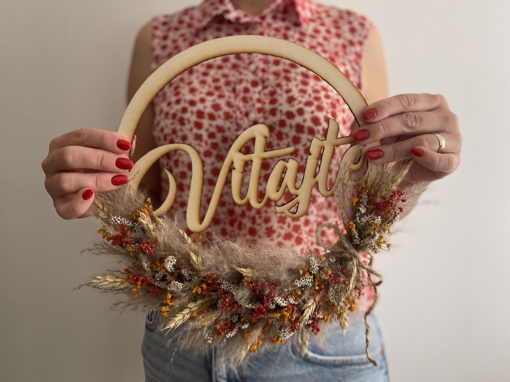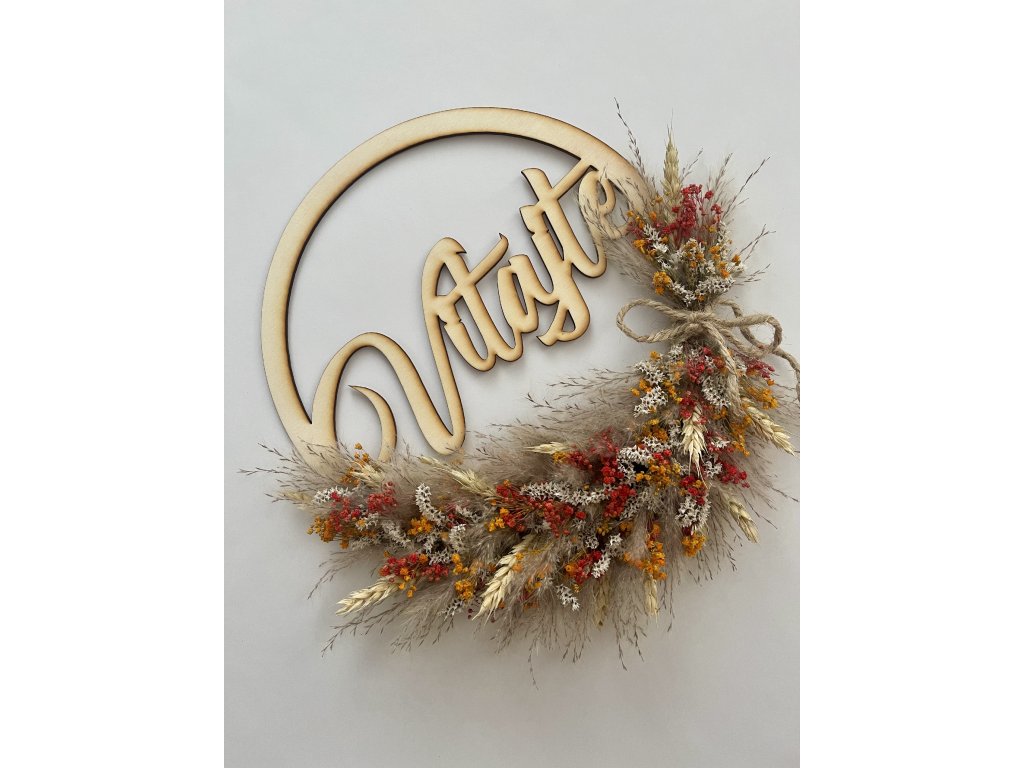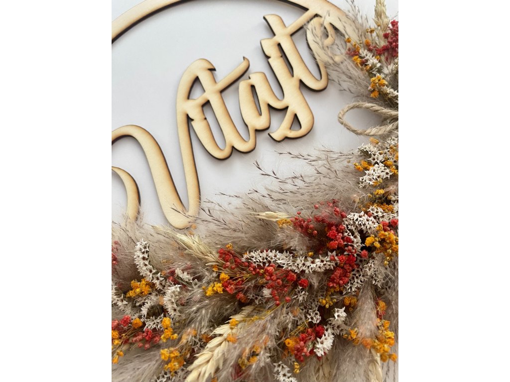 Privítajte svoju návšetvu, keď si na svoje vchodové dvere zavesíte tento ručne viazaný veniec na drevenom kruhu s elegantným nápisom Vitajte. Veniec je ručne viazaný z prírodných sušených a stabilizovaných kvetov, pričom dominujú klásky spolu s pampovou trávou v jesenných odtieňoch. Očarí Vás nielen vôňou ale aj farebnosťou, či svojou trvácnosťou.