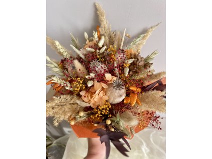 Kytica Jesene za jesennú cenu. Ručne tvorená kytica zo sušených, či stabilizovaných kvetín vo farbách jesenného lístia.
