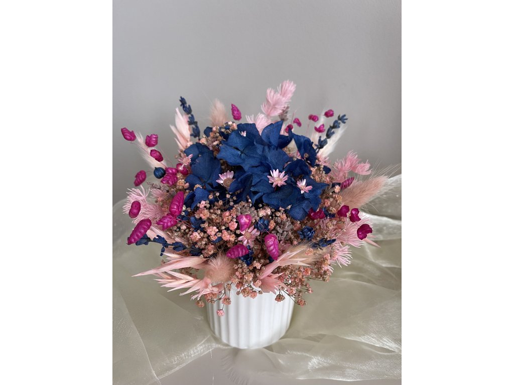 Kytička Blue Hortenzia je tvorená v hlavnej úlohe z tmavomodrej hortenzie a rožiarená ružovou gypsomilkou a doplnená rôznými druhmi sušiny - ako je ovos, lúčne trávy a iné. Kytička je ručne vypichovaná po jednom kvietku a zasadená do neutrálnej bielej keramickej nádoby. Kytička je vhodná ako dekorácia do Vášho domova alebo darček pre Vašich blízkych, či na kaviarensky stolík. Pozvite prírodu k Vám domov.