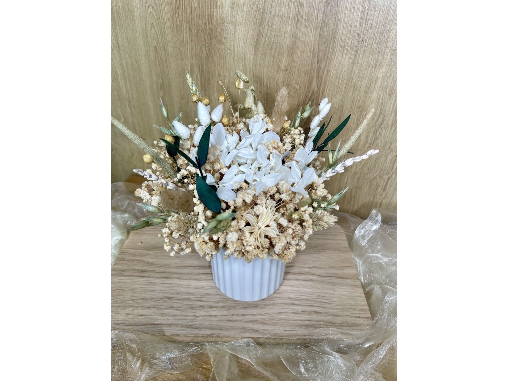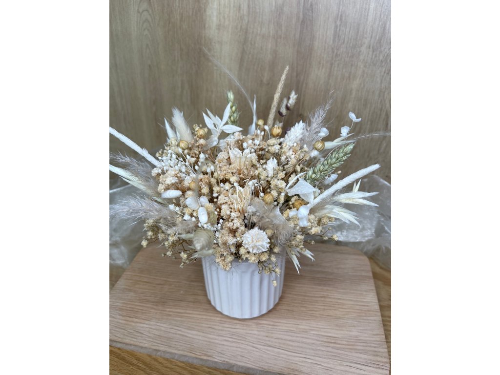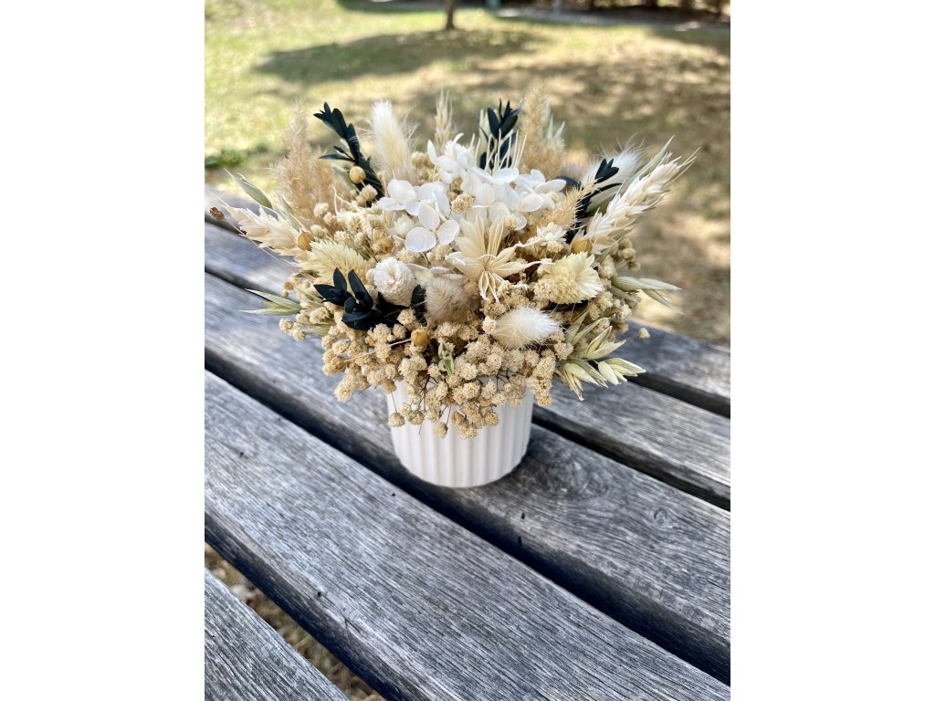 Kytička v keramickom obale je v prírodných tónoch. Nesie v sebe pokoj, jemnosť a vďaku. Prírodné tóny a sušené kvety sú nadčasové a potešia ako trvácny darček, ktorý nezvädne. Kytička je ručne vypichovaná po jednom kvietku a zasadená do neutrálnej bielej keramickej nádoby. Keď si k nej privoniate očarí Vás vôňa gypsomilky - známej aj ako nevestin závoj, lúčnych kvetín, či prírodnej sušiny. Kytička je vhodná ako dekorácia do Vášho domova alebo darček pre Vašich blízkych. Pozvite prírodu k Vám domov.