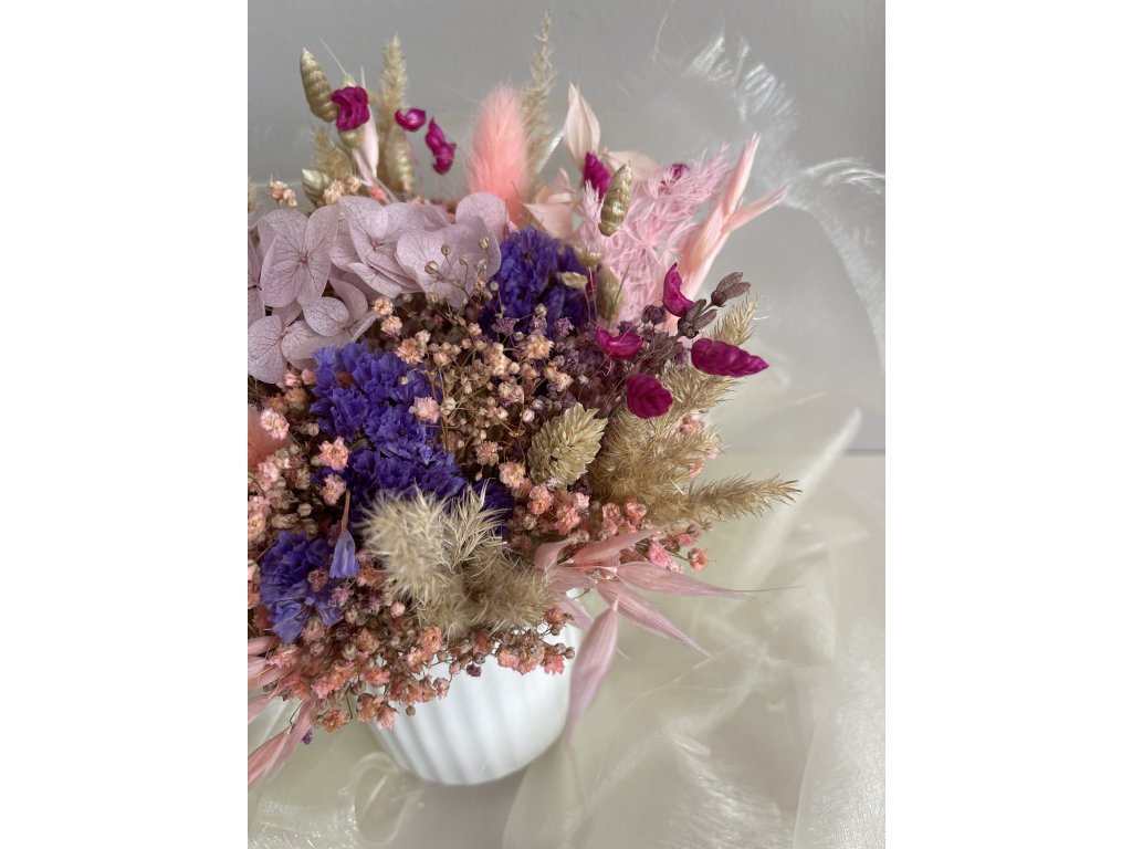 Kytička Dreamje tvorená v hlavnej úlohe v ružovo - fialovom tóne a nájdete tam hortenziu, asparagus a rôzne druhy sušiny - ako je ovos, lúčne trávy a iné. Kytička je ručne vypichovaná po jednom kvietku a zasadená do neutrálnej bielej keramickej nádoby. Kytička je vhodná ako dekorácia do Vášho domova alebo darček pre Vašich blízkych, či na kaviarensky stolík. Pozvite prírodu k Vám domov.