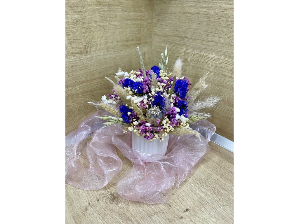 Ručne vypichovaná kytička zo sušených, či stabilizovaných kvetín v keramickom obale.