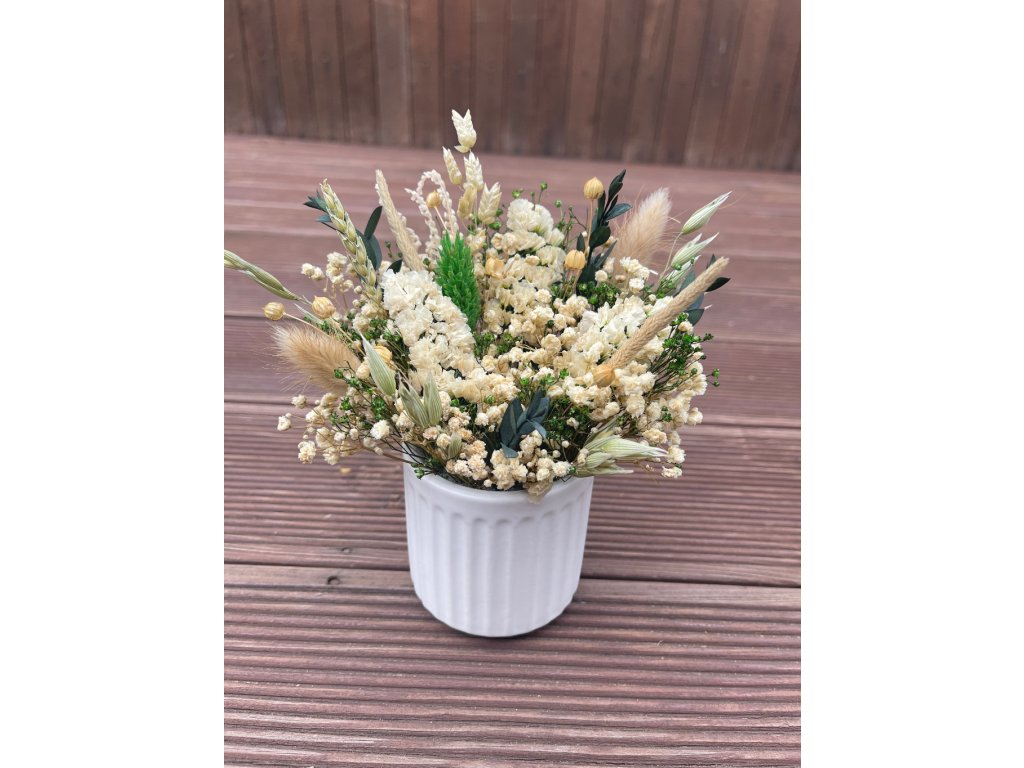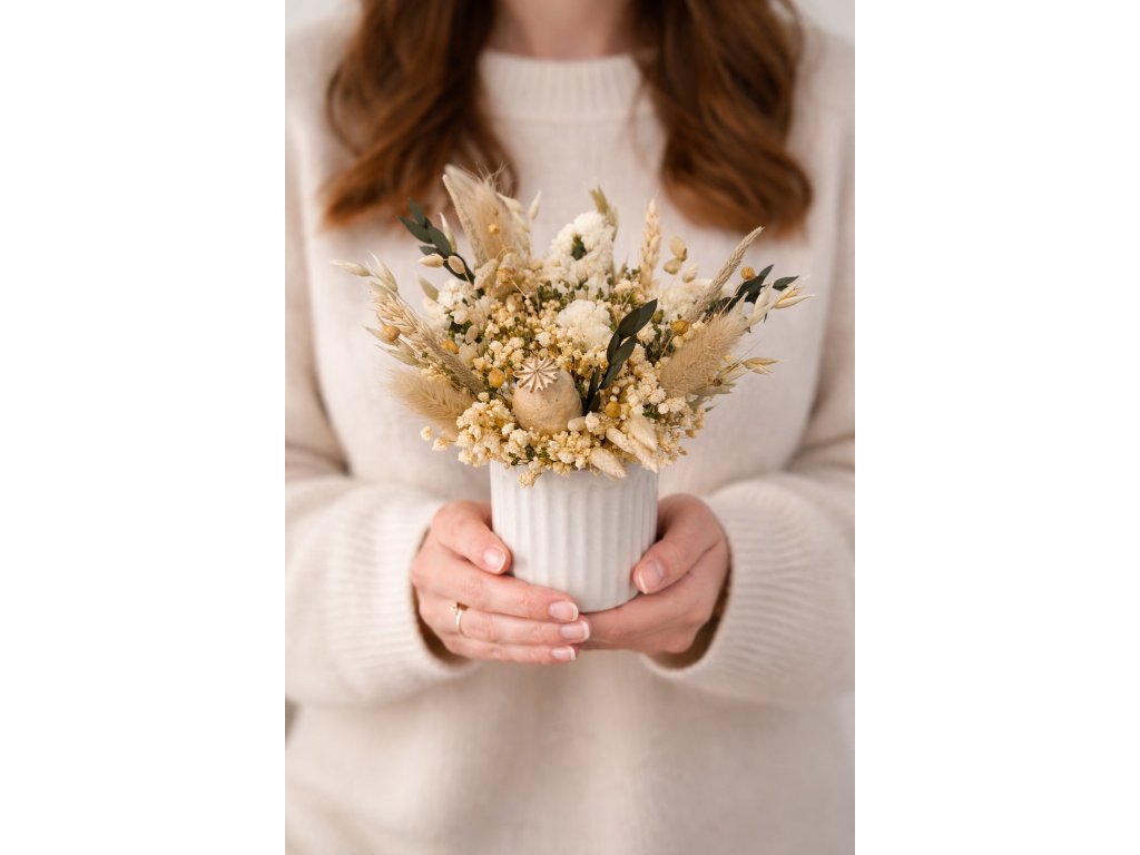 Ručne vypichovaná kytička zo sušených, či stabilizovaných kvetín v keramickom obale.