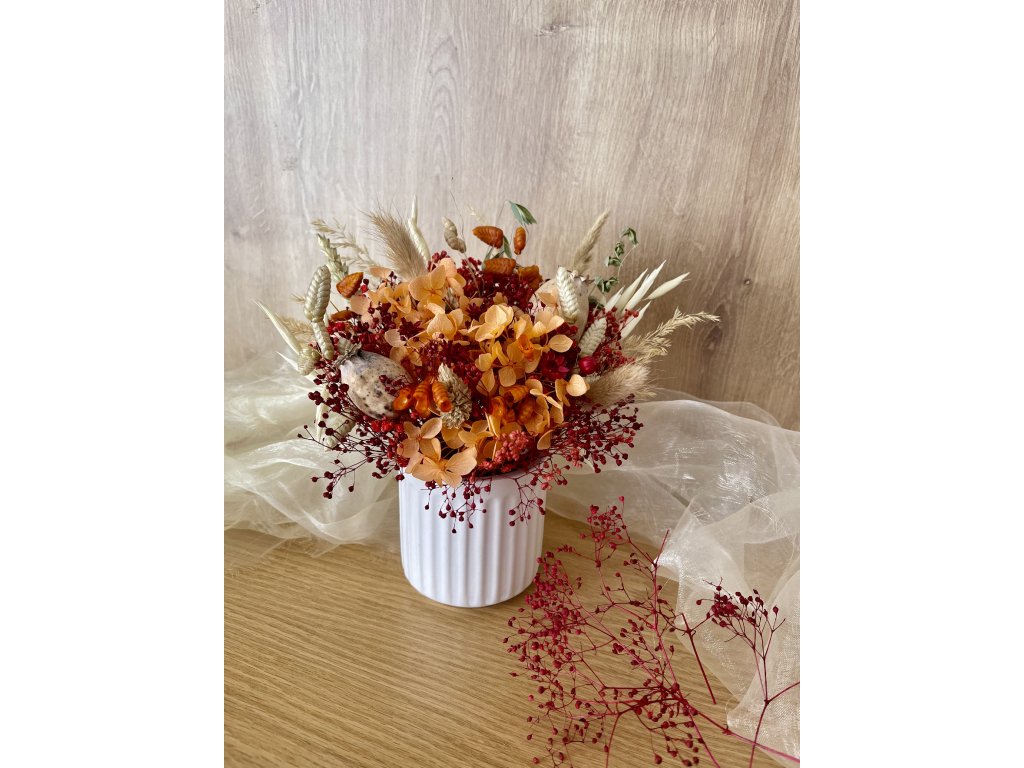 K jeseni neodmysliteľne patrí opadané jesenné lístie a tóny červenej, bordovej a orandžovej. Kytička je doplnená rôznými druhmi sušiny - ako je ovos, makovice, lúčne trávy a iné. Kytička je ručne vypichovaná po jednom kvietku a zasadená do neutrálnej bielej keramickej nádoby. Kytička je vhodná ako dekorácia do Vášho domova alebo darček pre Vašich blízkych, či na kaviarensky stolík. Pozvite prírodu k Vám domov.
