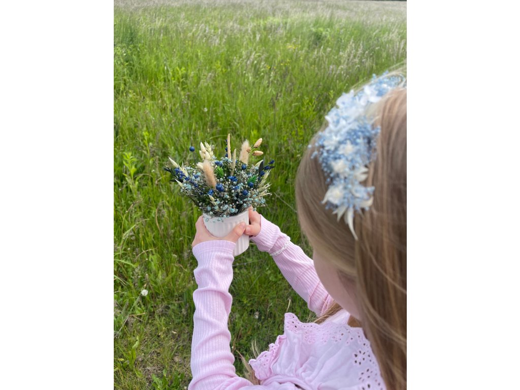 Máte radi pohľad na šíre more? V tejto kytičke nájdete svieže tóny zelenej, modrej a tyrkyrovej. Odtiene modro- zelenej gypsomilky v kytičke doplnené o sušinou sa bude vynímať na Vašej poličke. Kytička je ručne vypichovaná po jednom kvietku a zasadená do neutrálnej bielej keramickej nádoby. Pozvite prírodu k Vám domov.