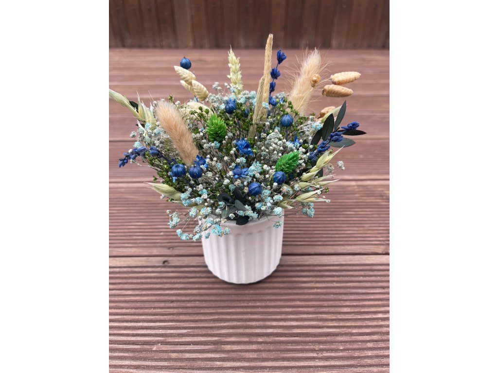 Ručne vypichovaná kytička zo sušených, či stabilizovaných kvetín v keramickom obale.