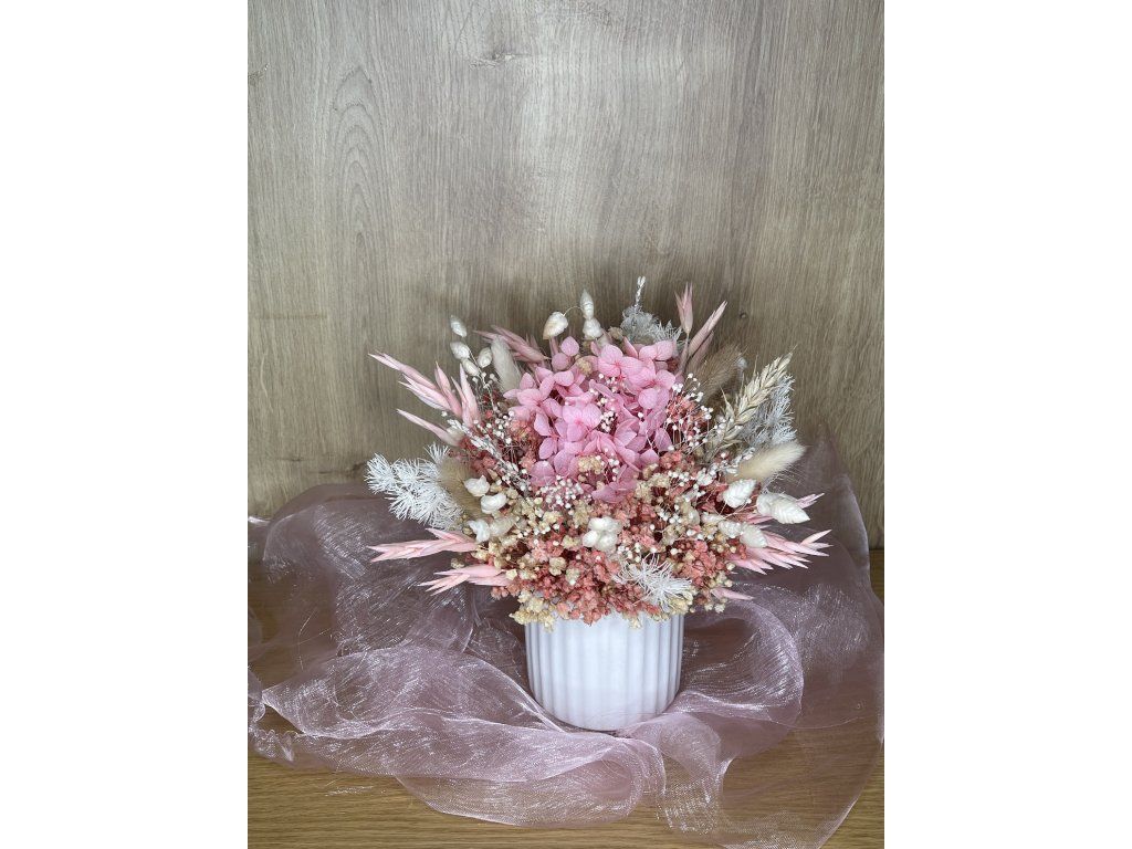 Romantická púdrovo-ružová hortenzia v spojení s gypsomilkou, prírodnou sušinou a ďalšími kvetinami, ktoré sú trvácne a vydržia Vám dlhodobo. Kytička je doplnená rôznými druhmi sušiny - ako je ovos, zajačie chvostíky, lúčne trávy a iné. Kytička je ručne vypichovaná po jednom kvietku a zasadená do neutrálnej bielej keramickej nádoby. Kytička je vhodná ako dekorácia do Vášho domova alebo darček pre Vašich blízkych, či na kaviarensky stolík. Pozvite prírodu k Vám domov.