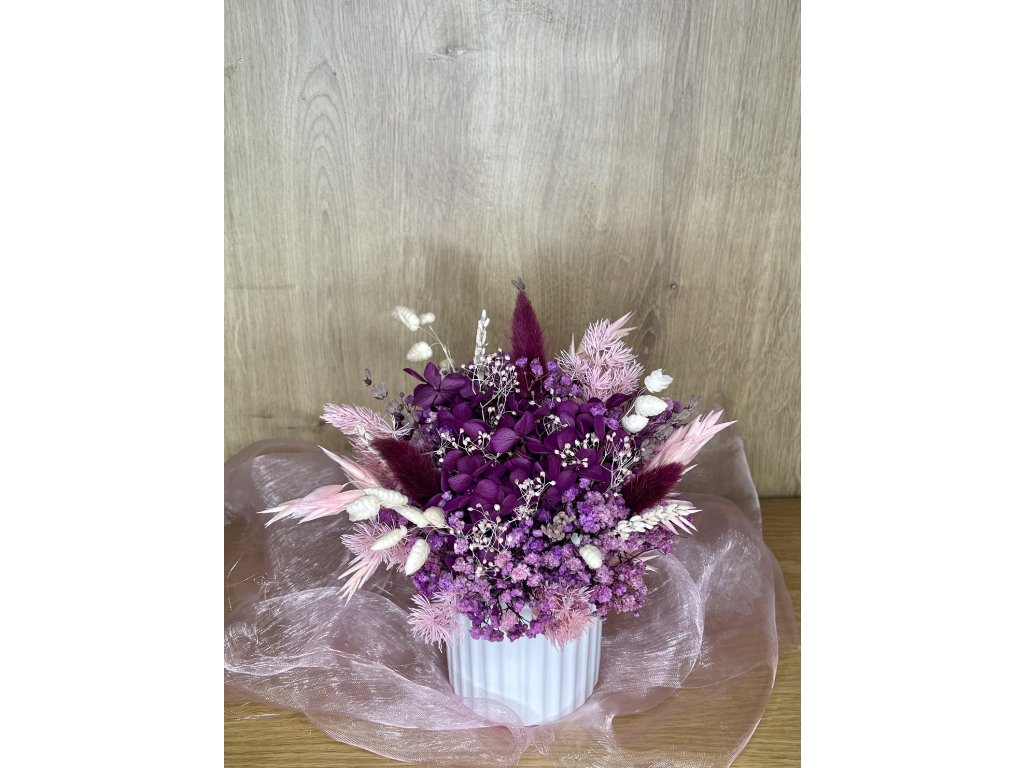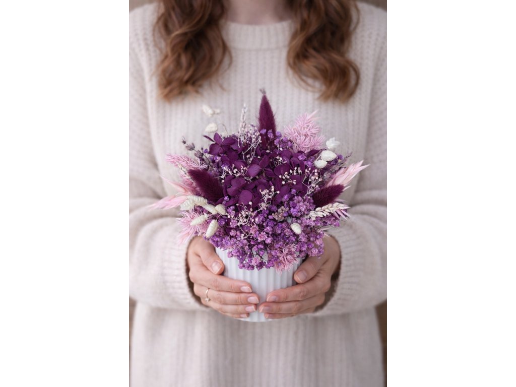 Tento úchvatný fialový odtieň Vás upúta na prvý pohľad. Zamilujte sa do vášnivo fialovej kytičky, kde hrá hlavnú úlohu kytička so stabilizovanou hortenziou. Kytička je doplnená rôznými druhmi sušiny - ako je ovos, zajačie chvostíky, lúčne trávy a iné. Kytička je ručne vypichovaná po jednom kvietku a zasadená do neutrálnej bielej keramickej nádoby. Kytička je vhodná ako dekorácia do Vášho domova alebo darček pre Vašich blízkych, či na kaviarensky stolík. Pozvite prírodu k Vám domov.