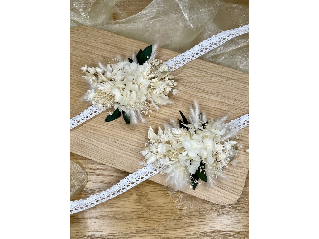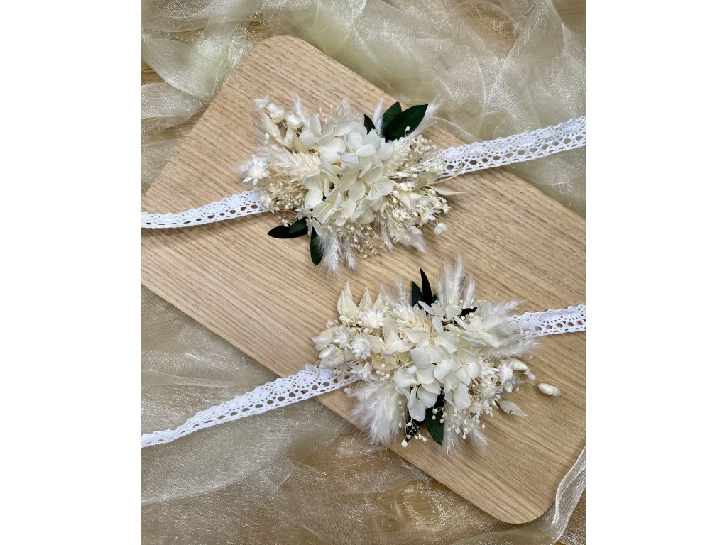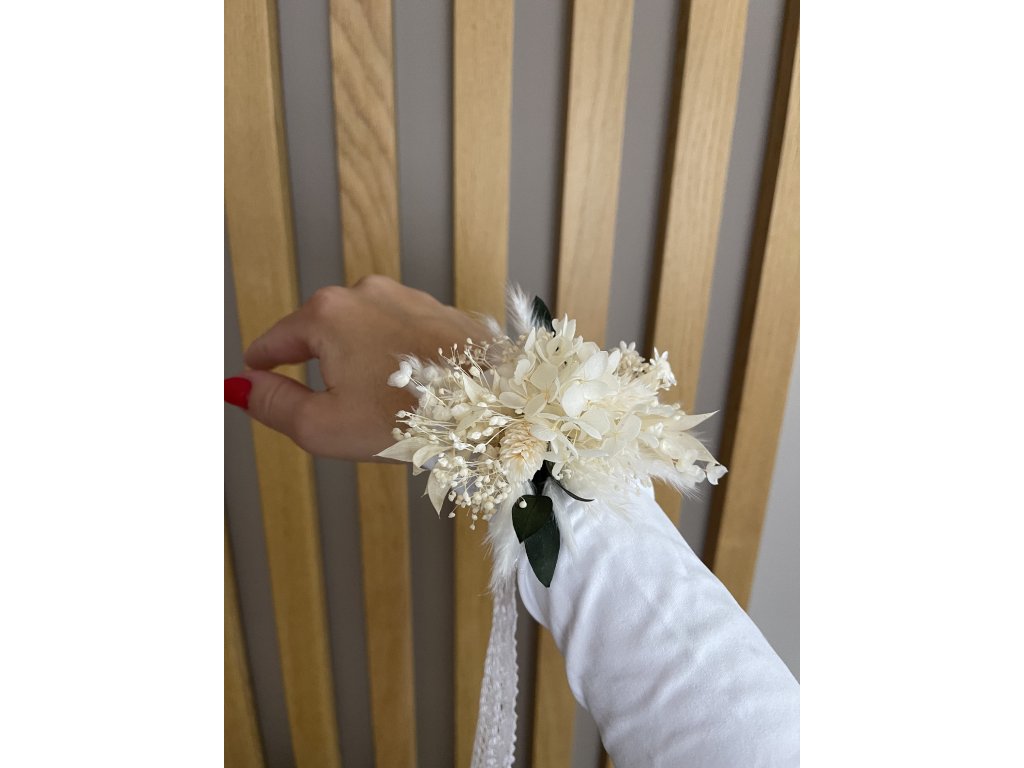 Všeobecná poznámka: Ručne vyrábané výrobky a prírodné kvietky použité v dekoráciach sa môžu jemne líšiť, sú možné jemné odchýlky v závisloti od dostupnosti kvetín, ale tón objednanej vecičky ostáva zachovaný. Výrobky nemajú radi vodu a dlhodobé priame slnečné svetlo :) Stužka použitá pri náramku sa môže líšiť podľa dostupnosti na sklade.