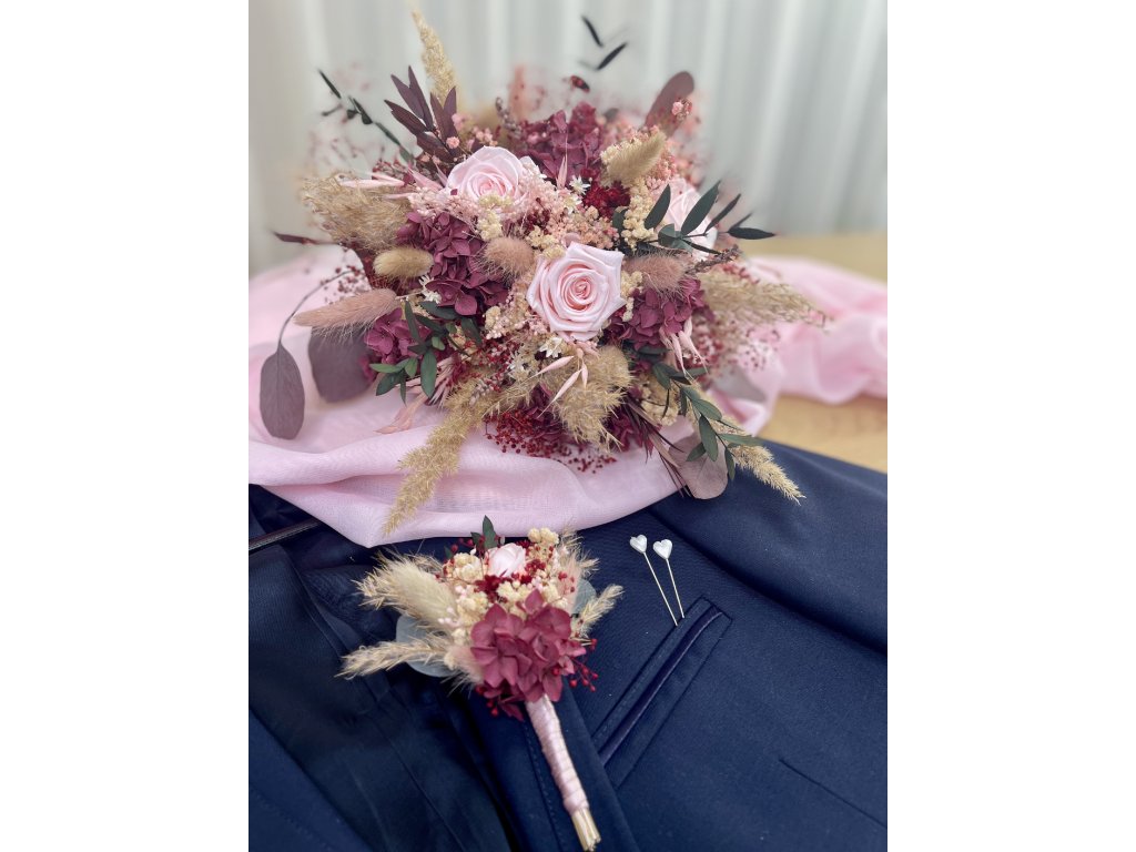 Pierko pre ženícha Bordó Love je ručne tvorené a jeho základom je eukalyptus, pampas tráva, stabilizovaná hortenzia, stabilizovaná ruža a ďalšie trvácne kvetiny.
