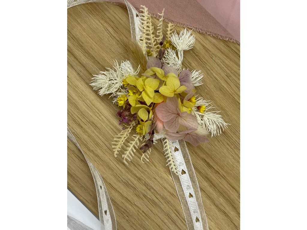 Všeobecná poznámka: Ručne vyrábané výrobky a prírodné kvietky použité v dekoráciach sa môžu jemne líšiť, sú možné jemné odchýlky v závisloti od dostupnosti kvetín, ale tón objednanej vecičky ostáva zachovaný. Výrobky nemajú radi vodu a dlhodobé priame slnečné svetlo :) Stužka použitá pri pierku sa môže líšiť podľa dostupnosti na sklade.