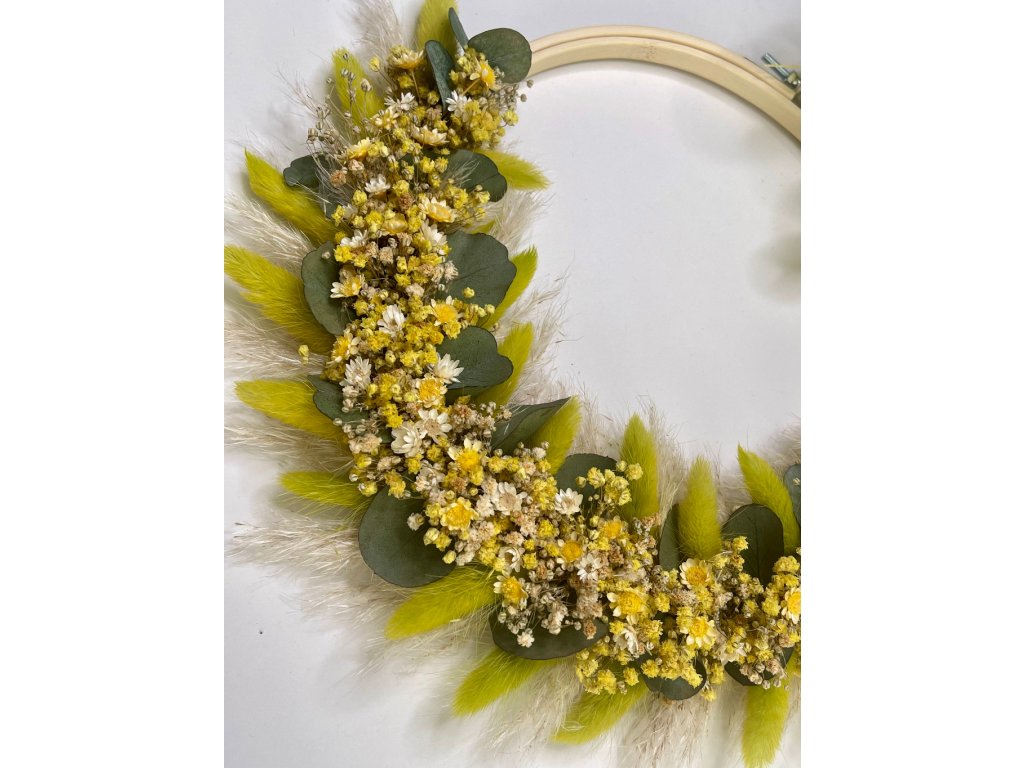 Veniec plný optimizmu a sviežosti. "Veniec Energia" v sebe nesie krásu prebúdzajúcej sa prírody – sviežo zelené lagurusy, nežné sušené kvietky v odtieňoch žltej a bielej, doplnené eukalyptom a prírodnou čipkou. Základ tvorí drevený vyšívací rám, ktorý dodáva vencu ľahkosť a rustikálny nádych.