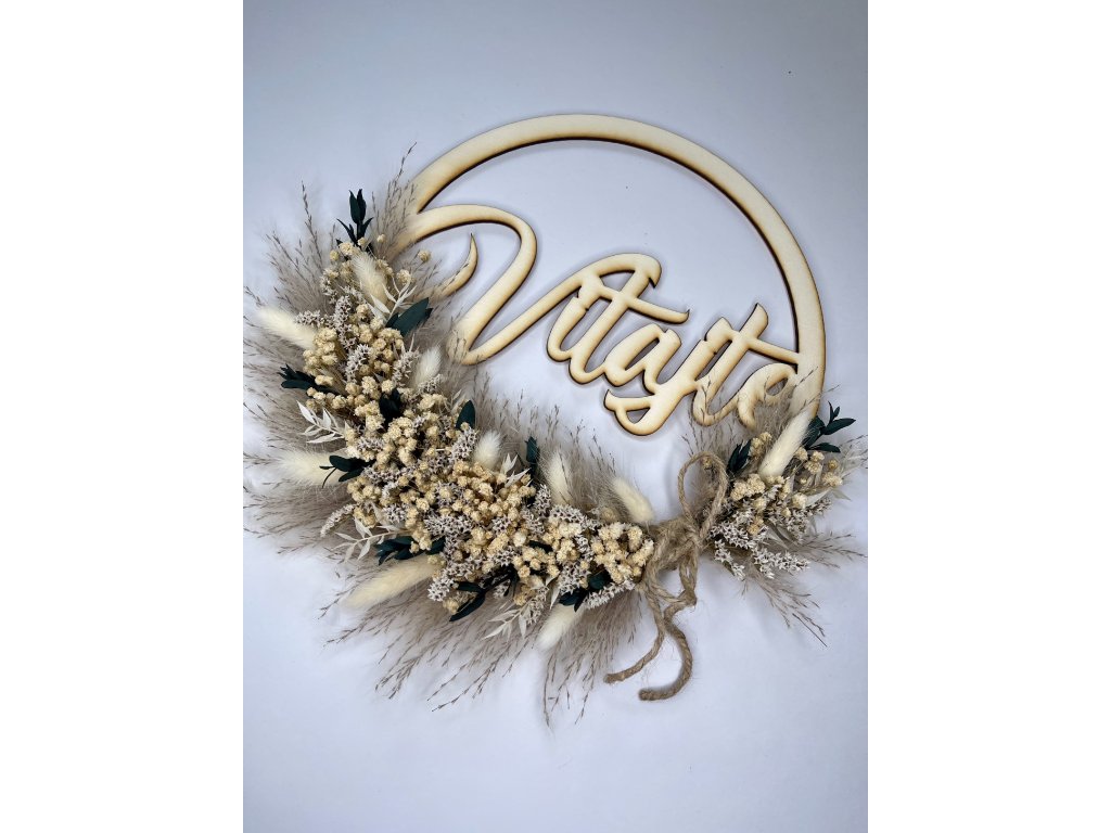 Privítajte svoju návšetvu, keď si na svoje vchodové dvere zavesíte tento ručne viazaný veniec na drevenom kruhu s elegantným nápisom Vitajte. Veniec je ručne viazaný z prírodných sušených a stabilizovaných kvetov, pričom dominujú klásky spolu s pampovou trávou v prírodnom tóne. Očarí Vás nielen vôňou ale aj farebnosťou, či svojou trvácnosťou.