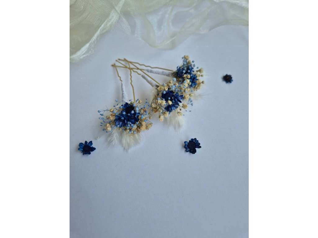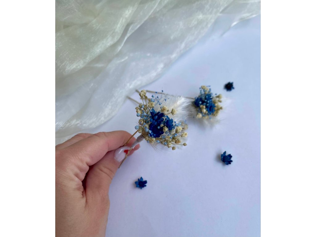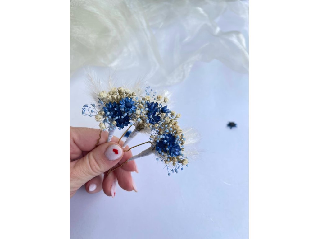 Vlásenky si viete ľubovoľne doplniť do účesu a sú tvorené z gypsomilky a doplnené o tmavomodré kvietky, či jemný pampas.